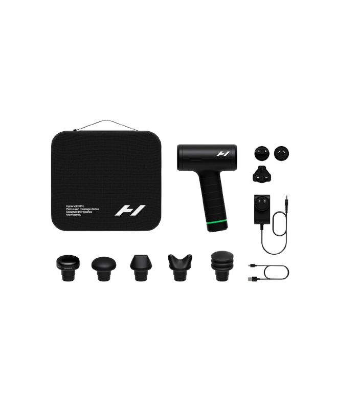 Ce contine pachetul: dispozitiv Hypervolt 3 Pro, 5 capete de masaj (inclusiv cap cu incalzire), incarcator 18V, husa premium pentru transport.